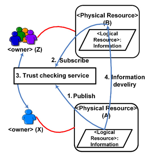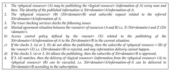 Let us assume that the <owner> (Z) has a <physical resource> (B), which wants to subscribe the <logical resource> information that is published by the <physical resource> (A), which belongs to the <owner> (X), Figure 8. The respective information-sharing algorithm is represented in Figure 9.