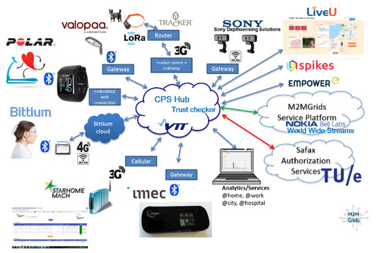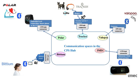 The attachment of physical resources to the CPS hub can be either direct or indirect, as clarified in Section 3.4. Let us have a look at some physical resources of the traffic accident case; Figure 11. In the experimental case, the direct attachment of the Polar smart watch was applied using a smart phone as a gateway. The embedded CPS hub connector enabled the communication with the virtual spaces of Polar in the CPS hub; green oval in Figure 11. While, for example, the Tracker dog collar applied the indirect method for communication with the CPS hub. The reason for this was the specialized optimized communication between the collars and the Tracker router and service cloud. A specialized gateway with the CPS hub connector was applied to register the presence of collars to the CPS hub. In this way, the presence of all the online collars in the Tracker service cloud could be registered in the CPS hub. However, the scalability of the experimental CPS hub services was found to be a challenge in this case. The indirect attachment methodology was also applied with the Bittium medical Electroencephalography (EEG) sensor, IMEC CO2 sensor, and Valopaa street illuminator in the traffic accident case.