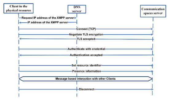 Initially, the administrator of the CPS hub makes the communication spaces for the users/owners of the physical resources (devices/servers) by making them accounts with the CPS hub server. After this step, each of the owners has a communication space in which the physical resources owned by the user can be registered. The communication spaces and presence services of the CPS hub assume that there is an XMPP client embedded in the physical resources. Such a client connects the physical resource to the server who is hosting the virtual communication space of the owner. The procedure, clarifying how a client in a physical resource connects into the communication spaces server, is visualized in the Figure 13.