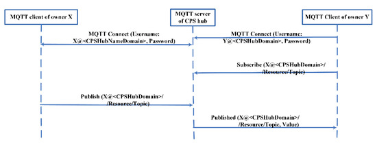 The sharing of information contains the following phases; Figure 7. The first phase connects the owner to the CPS communication hub, authentication of the owner, and registration of the presence of the physical resources of the owner into the home domain of the owner. As the result of this step, the presences of the physical resources are registered in the communication spaces of the owner in the CPS communication hub. The referred resources can be identified by <owner>@<domain>/<resource> notation.