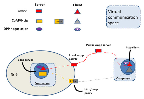 The MQTT server and MQTT subscriber clients run in the NS-3 network simulator environment, being clients of the simulated lr-wpan/6lowpan network. The MQTT server also has a Local Area Network (LAN) interface to company intranet. The MQTT publisher client runs on company intranet. The XMPP clients running in the NS-3 simulator connect to the virtual communication server (public XMPP server) via the local XMPP server, whereas the MQTT publisher client running on company intranet can register directly to the virtual communication server.