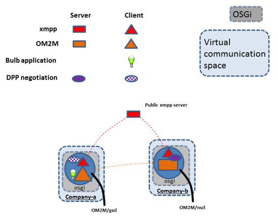 Validation arrangements for experimenting data plane negotiation with OneM2M protocol are shown in Figure 24. The system comprises a server for virtual communication spaces (XMPP server) and two OneM2M/ETSI M2M components, Network Service Capability Layer (NSCL) and Gateway Service Capability Layer (GSCL). NSCL and GSCL run in the Open Service Gateway Initiative (OSGI) framework [30,31,32,33]. Embedded in GSCL, there is a bulb application status, which can be monitored via NSCL using the methods provided by the OneM2M framework.