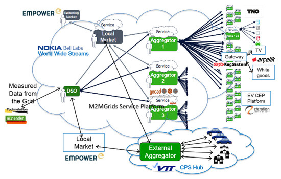 The energy flexibility case is described in the work of [24], and overviewed shortly in the following. There are a number of buildings, each of which have a specific set of energy sensitive resources (white goods, boilers, heating resources), and electric vehicles, which are controlled by multiple energy aggregator services, in turn acting on a local market; Figure 25. The status and load balance in the electrical grid is monitored and compared with the forecast in real time. A distribution service operator (DSO) detects a need for flexibility and asks for bids from the aggregators on the local market every 15 min in a 24 h forecast window. The aggregators make their bids, based on the flexibility capacity of the energy resources they control, considering energy market prizes and restrictions as set by the energy resource owners. The flexibility is related to possibility to shift the energy consumption or production to another timeslot in a controlled way. For example, the energy consumption of white goods, boilers, heaters, or electric vehicle charging can be moved to happen earlier or later, or, if possible, at a lower or higher pace, depending on the constraints the device user has set. The local market can mix and match the aggregator bids to the flexibility asked by the DSO. When a bid is awarded, the aggregator can fulfil the corresponding flexibility by instructing the individual devices. As such, the electrical grid power balance can be maintained better, with flattened, lowered differences between energy production and consumption, in effect having the finer-grain consumers/producers follow the fluctuations of (renewable) energy production. This is beneficial because DSOs can save on energy storage investments; new aggregator businesses can conduct sound, revenue-generating business cases; and households and vehicle owners get energy bill rebates for their flexibility contribution. The experimental case enabled automatic and real-time energy flexibility, which addressed real needs of the energy sector, which is challenged by the introduction of ever more renewable, but intermittent energy sources, and the ever more distributed nature of both production and consumption [24].