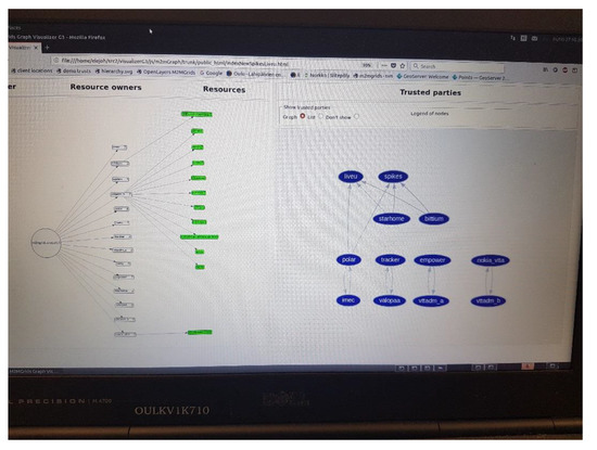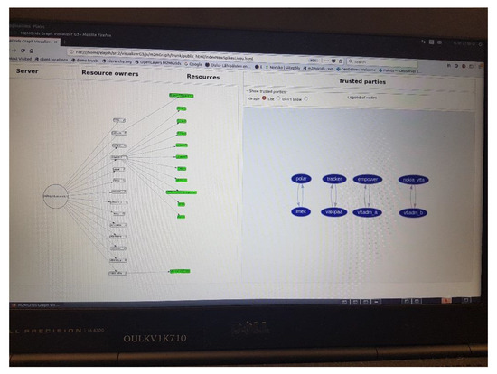 The visualization screenshot shows that after the alarm event has happened, the trust relationships between the owners are updated according to their policies. Finally, the information from the heart rate measured via the Polar smart watch, the video picture captured by Starhome camera, the CO2 level measured by IMEC sensor, and the entropy stream extracted relying on the information published by Ekg/Egg sensor of Bittium can be seen in the screen provided for the authorities from the traffic accident area after the alarm has happened; Figure 30.