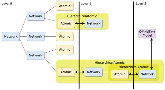 where atomic and network are the contained atomic and network DEVS model, respectively. {transport} is the set of transport functions that transfer the models’ state and select is the function that chooses the currently active model. In more detail, the new type of model—in the following called Hierarchical Atomic—is defined: