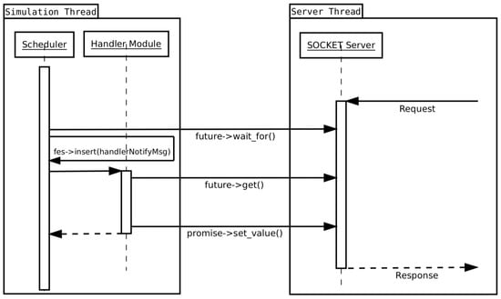 The main difficulty for this task is to properly synchronize the socket requests with the discrete event scheduler of OMNeT++. First, the simulation has to be executed in real-time. This can be achieved by synchronizing event-time with wall-clock time, i.e., delaying the execution of events in the scheduler. The time between two events could then be utilized by the scheduler to listen and process socket data and, if necessary, inject new events into the event-queue to process received data. In this work, however, a separate socket server-thread is used to preprocess all incoming, and postprocess all outgoing data on the socket. By this way, the processing-impact on the simulation is minimized, since only relevant data are exchanged with the simulation thread. All other processing steps, e.g., communication and protocol overhead, are then transparently handled by the server-thread without impact on the simulation. The simulation-scheduler has then to wait for notifications of the server-thread instead of socket requests. This is achieved with promise and future objects from the C++ standard library. Figure 3 shows the basic concept of synchronization between the socket server-thread and the simulation thread.