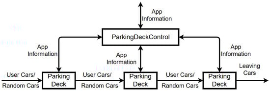 The information about car arrivals will be forwarded to the different parking decks in sequence. When entering the facility, the parking decks have to be traversed until the desired parking spot is reached. When a car leaves the ParkingFacility, the decks have to be traversed again in order to reach the exit. Additionally, the ParkingDeckControl is used to send information from and to the model of the APP.