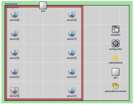 The lowest level of the simulation scenario was modeled with OMNeT++ 5.4.1 and INET 4.0. Here, the information produced by the higher levels described above was used to dynamically instantiate simulated entities and to represent the communication between sensors, actuators, and the APP with the advanced capabilities of INET.