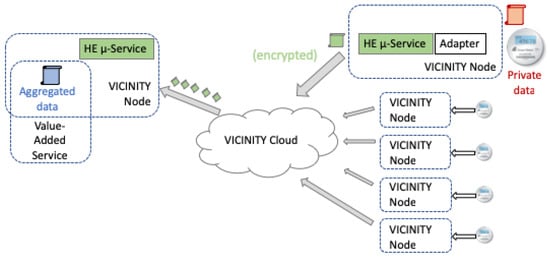 VICINITY’s architecture offers privacy built-in by design, as only metadata on the connected devices is stored in a central cloud. Sensitive information, e.g., sensor readings, are transmitted peer-to-peer only from the data producer to its intended consumer. Additionally, this needs to be approved by the data owner in advance and on an individual basis. However, once the data owner has given his consent, his data are given out and will be available to potentially malicious third parties, which may seem trustworthy at first glance. As Value-Added Services (VAS) are the key to making the whole IoT “smart”, a user may be tempted to share his data with such a service, even though he would rather not give out his information. An even better approach would be to never give away any sensitive data (in clear text), yet still allowing the VAS to work. What may sound contradicting is exactly what is possible with the use of homomorphic encryption (HE) Schemes. Homomorphic encryption enables certain calculations, or, in the case of fully homomorphic encryption, any arbitrary function to be executed on encrypted ciphertexts without the need to decrypt this data first. Partially homomorphic encryption has been subject to research for quite some time, only enabling a limited number of operations to be executed. With the introduction of a fully homomorphic encryption Scheme by Craig Gentry in 2009 [5,6], any arbitrary computation is now possible on ciphertexts with no need to decrypt and giving out any cleartext information at all. However, fully homomorphic encryption is more expensive in terms of computational demand, so people need to decide on a trade-off between performance and versatility. As we demonstrate in Section 5.5, using our Framework enables us to evaluate different options in a realistic but controlled environment.