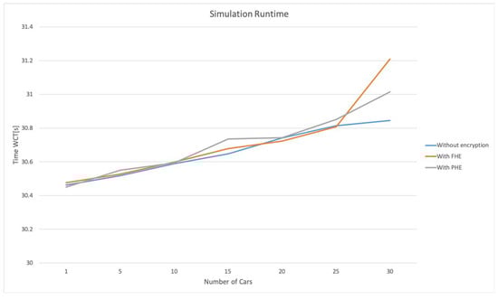 As can be seen in Figure 10, the runtime results of different simulation runs increase with an increasing number of cars which participated in the described VAS. This can be explained by the rising computational cost of simulating the necessary communications between the VAS participants. The increase of runtime of the simulation scenarios which use homomorphic encryption compared to the scenario without it stems from two separate causes: first, the pure computational cost on the service side for the encryption; and, second, the time necessary to send the huge (in comparison to unencrypted data) response ciphers into the simulated network and over real ethernet.