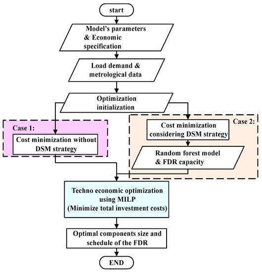 DSM programs are procedures that attempt to modify the energy demand of the power system in order to improve the overall system efficiencies. Appropriate implementation of DSM can provide the necessary operational flexibility by transferring the FDR from one period to another. Figure 2 illustrates the proposed planning framework for the system without and with DSM strategy consideration (Case 1 and 2, respectively). The objective of the planning framework is to minimize the total investment costs of the microgrid. The FDR planning is included as DSM strategy to implement effective scheduling scheme for the shiftable load demands. The FDR is activated to minimize the gap between generated power and load demand in the most cost-effective way based on sufficient system conditions. The scheduling of the FDR takes into consideration the difference between the forecasted total generation and the load demand by using the random forest prediction model. System constraints considered in the optimization comprise of both the capacity size limitation of the components (BESS, PV and WT) and the operational constraints of the BESS such as charging/discharging power, BESS state of charge, load demand and power supply balance, DSM and shiftable load capacity constraints.