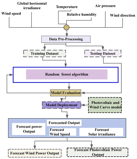 The model fitting or training of data-driven forecasting model is achieved by establishing underlying patterns among historical input variables [24]. Thus, its success relies heavily on appropriate input parameters selection, and the data pre-possessing. The candidate input data set for the model consists of a number of variables such as humidity, wind speed, pressure, solar irradiance, temperature, etc. A data-driven framework is based on the standard methodology of data science, and the main stages are as outlined; data pre-processing, model training, validation and final deployment. Data pre-processing might integrate all or some of these standard techniques: transformation, integration, normalization, cleaning etc. The subsequent process includes modeling, performance evaluation, and final deployment [25]. The schematic forecasting framework adopted in this study is shown in Figure 3.