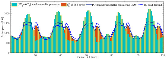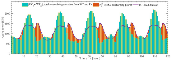 Aggregated renewable power generation, battery energy storage system (BESS) power and the load demand profiles without the consideration of the DSM strategy (case 1).