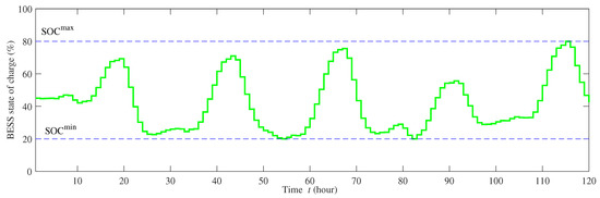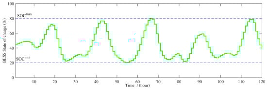- BESS constraints: the energy stored in the BESS must be bounded within the minimum () and the maximum state of charge () limit.