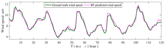 A graphical comparison of the actual versus the forecasted wind speed with one-time step ahead rolling horizon using Random Forest (RF) forecasting model for (1/12/2018 to 5/12/2018).
