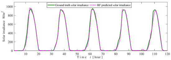 A graphical comparison of the actual versus the forecasted solar irradiances with one-time step ahead rolling horizon using RF forecasting model for (1/12/2018 to 5/12/2018).
