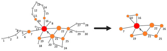 According to the degree of the node and the shortest path length from the node to the center node of the community, the topological location of nodes in the community structure reflects the contribution of nodes to the community structure. As shown in Figure 2, the importance of nodes is assessed by calculating their potential in the community structure. According to the order of importance, the internal nodes of the community are divided into three categories: (1) Node 9 is the most important one as it has extreme topological potential and is the center node of the community, being marked with red on the left subgraph of Figure 2 and expressed with ; (2) Nodes 7, 19, 21, 22, 25, 26, 10, and 16 have a great influence on the center node of the community, marked with yellow on the left subgraph of Figure 2 and expressed with ; (3) The remaining nodes are fringe nodes, marked with gray on the left subgraph of Figure 2 and expressed with . The center node of the community is chosen as the representative point, and the nodes that contribute greatly to the topological potential of the representative point are chosen as the relatively important nodes.