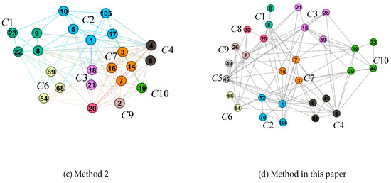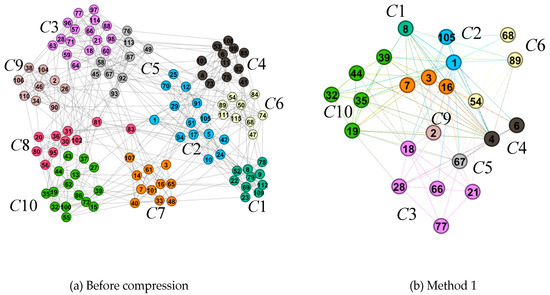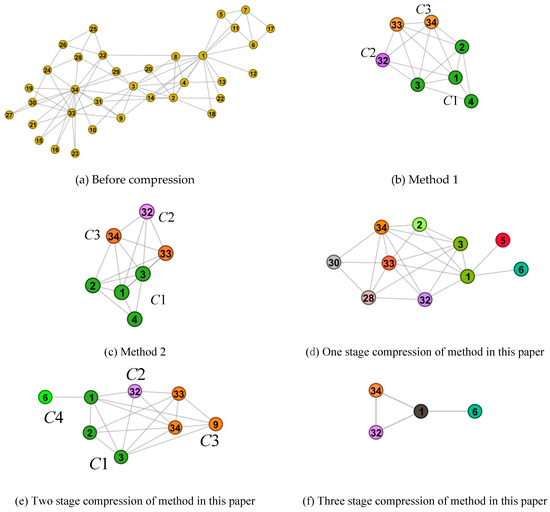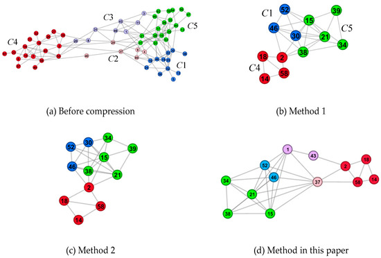 In addition, compression based on community structure is more conducive to the perception of the overall structure of the network and the interaction between communities. Taking Figure 3d as an example, it can be found that the original network can be divided into five societies. Among them, C1 and C5 contain a large number of nodes, while the other three have a small number. The interaction between C1 and C5 is mainly realized through C2 and C3. Although there are few nodes in the C2 and C3 communities, they play a “bridge” role in the interaction of nodes in the whole network, which is very important to the topology of the network. However, C2 and C3 communities are not retained in Figure 3b,c, which cannot accurately reflect the “bridge” role of the C2 and C3 communities. C4 directly interacts with C1, which easily causes deviation in users’ understanding of the structural features of the network at the mesoscopic scale.