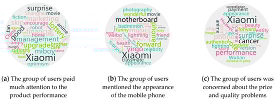 For the related influencer accounts, users in the same cluster recommended each other’s following list. At the same time, word clouds were generated from the text information of users in each cluster by word cloud tools. The degree of attention and participation of different user groups on products were obtained. As shown in