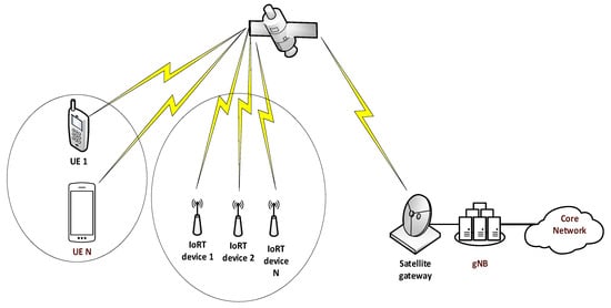 The 5G satellite Radio Access Networks (RAN) are envisaged to use Orthogonal Frequency Division Multiple Access (OFDMA) and support multiple antenna transmission schemes. Satellite technology can adopt OFDMA due to the fact that OFDMA allows flexible bandwidth operation with low complexity receivers and easily exploits frequency selectivity []. The Multi-User Multi-Input Multi-Output (MU-MIMO) mode that allows simultaneous transmission to multiple users is considered. The 5G New Radio (NR) base station termed gNB is expected to be also suitable for satellite network scenario and is assumed to be located on the earth station. Both the satellite gNB and the User Equipment (UE) are considered to have multiple antennas; each assuming a baseline of 2 × 2 MIMO configuration. The 5G NR modulation technique and frame structure are designed to be compatible with LTE. The 5G NR duplex frequency configuration will allow alignment among 5G NR, NB-IoT and LTE-M subcarrier grids []. Hence, it is expected that the 5G NR user equipment (UE) will not only exist with 5G satellite networks but also coexist with satellite LTE networks.