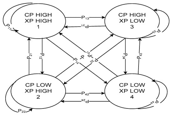 The channel model that is considered in this paper is an empirical-stochastic model for Land Mobile Satellite MIMO (LMS-MIMO) used in [,]. The stochastic properties of this channel model are obtained from the S-band tree-lined road campaign’s measurement done in a suburban area using dual circular polarizations. The Markov model in Figure 2 is used to determine the large-scale fading (shadowing) states, which varies between low and high shadowing values for both co-polar and cross-polar channels. The four possible states in the Markov model are due to the high or low shadowing state of both the cross-polar (XP) and co-polar (CP) channels. The 4 × 4 transition matrix, P, below obtained from the measurement in [] is used to determine the next possible channel state. State 1 is CP High XP High, State 2 is CP Low XP High, State 3 is CP High XP Low and State 4 is CP Low XP Low. The top right corner value of 0.1037 is the probability of “CP High, XP High” to “CP Low, XP Low”.