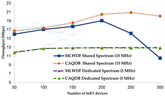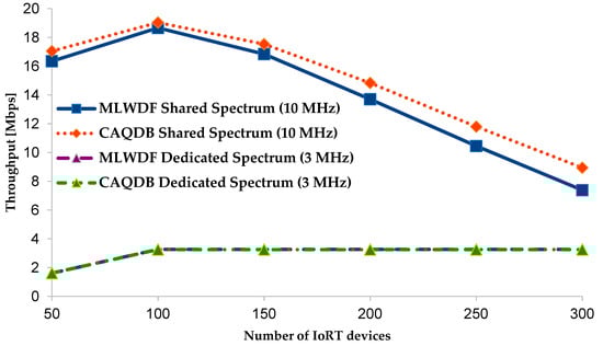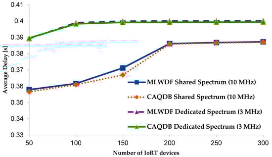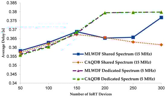 However, as shown in Figure 6, in scenario B, both spectrum management schemes produce a very close average delay performance up to 150 IoRT devices for both schedulers. But, as the number of IoRT increases from 150, the shared spectrum management for both schedulers produces a better average delay performance up till 250 IoRT devices. From 250 to 300 IoRT devices, the average delay performance of shared spectrum management scheme using MLWDF becomes increasingly poorer until it reaches the same level of performance as the dedicated spectrum management scheme but the proposed CAQDB scheduler is able to maintain a better average delay performance. The average delay performance results also confirm the impact of packet scheduler on the performance of spectrum management schemes.