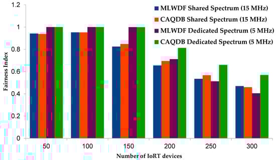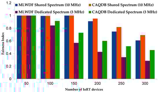 The fairness index performances for both scenarios A and B are presented in Figure 7 and Figure 8, respectively. In scenario A as shown in Figure 7, though, all the spectrum management schemes have the same fairness index for 50 IoRT devices but as the IoRT devices increase, the shared spectrum management scheme for both schedulers performed better than the dedicated spectrum management scheme. In addition, the CAQDB scheduler performed better than MLWDF scheduler for both shared and dedicated spectrum management scheme. In scenario B, as depicted in Figure 8, the dedicated spectrum management scheme edges the shared management scheme for both schedulers and the CAQDB scheduler edges the MLWDF scheduler fairness index performance for the dedicated spectrum management scheme. Even though, the fairness index performance trend for both scenarios are different, the impact of scheduler on the spectrum management scheme performance is further established from these set of results.