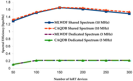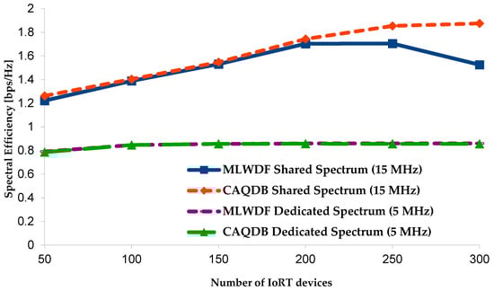 The overall spectral efficiency results of the two spectrum management schemes are presented in Figure 9 and Figure 10. As shown in Figure 9 and Figure 10, the spectral efficiency performance of the shared spectrum management scheme for both schedulers is much better as compared to the dedicated spectrum management scheme across varying number of IoRT devices. The same performance comparison is experienced in both scenarios A and B. Hence, it can be deduced that the shared spectrum management scheme allows the spectrum to be fully utilized as a result of mixed use case scenario, such that whenever the spectrum is not been used by IoRT devices, the video streamers are utilizing the spectrum and vice versa. The performance of the two schedulers are very close for the dedicated spectrum management for both scenarios, however, the same can only be said for shared spectrum management scheme in scenario A. In scenario B, the proposed CAQDB scheduler produces a better spectral efficiency from 200 IoRT devices upward but close performance below 200 IoRT devices. This further shows that the scheduler has an impact on the performance of a shared spectrum management scheme, especially as the number of IoRT devices increase.