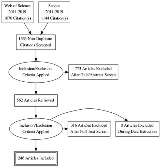After the exclusion of irrelevant articles, the data from 246 relevant articles were extracted from the original search results. The selection process is illustrated as a Preferred Reporting Items for Systematic Reviews and Meta-Analyses (PRISMA) [34] flow diagram in Figure 2.