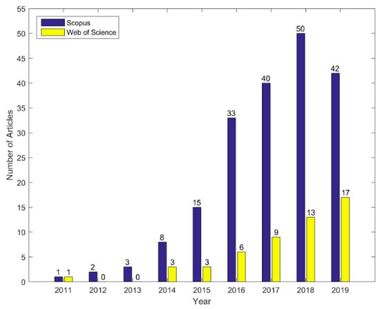 Number of research papers on IoT for AAL published between 2011 and 2019 (according to Scopus and Web of Science data).