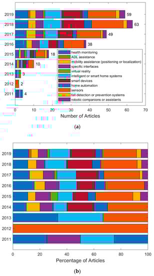 Summary of solutions for older people addressed by IoT systems. (a) Number of papers published in 2011–2019. (b) Percentage of papers published in 2011–2019. The list of problems follows a taxonomy of AAL systems outlined in [35]. Note that some papers have overlapping topics.