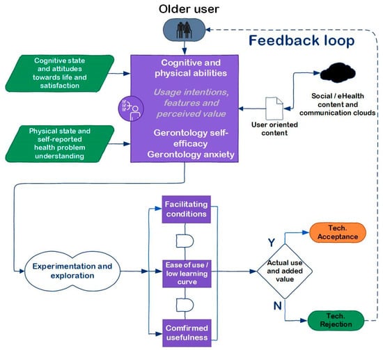 The technology acceptability models, selected to be compatible with applications for older people to accept and use a technology, starts with the very classical TAM model [73]. TAM explains the user’s behavior when using ICT can be used to understand the usefulness of technology via the attitudes of the use. The usefulness of TAM comes from understanding users’ adoption and use of emerging technologies, which is predicated by the person’s perceptions of the benefit from using the technology the and ease of use.