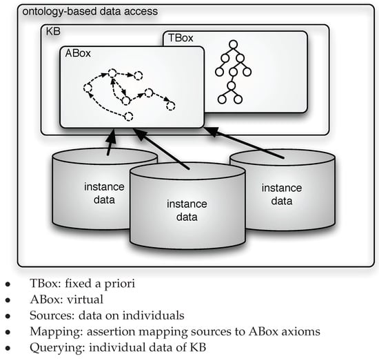 - Xiao, G.; Calvanese, D.; Kontchakov, R.; Lembo, D.; Poggi, A.; Rosati, R.; Zakharyaschev, M. Ontology-Based Data Access: A Survey. In Proceedings of the 27th International Joint Conference on Artificial Intelligence (IJCAI), Stockholm, Sweden, 13–19 July 2018; pp. 5511–5519. [Google Scholar]