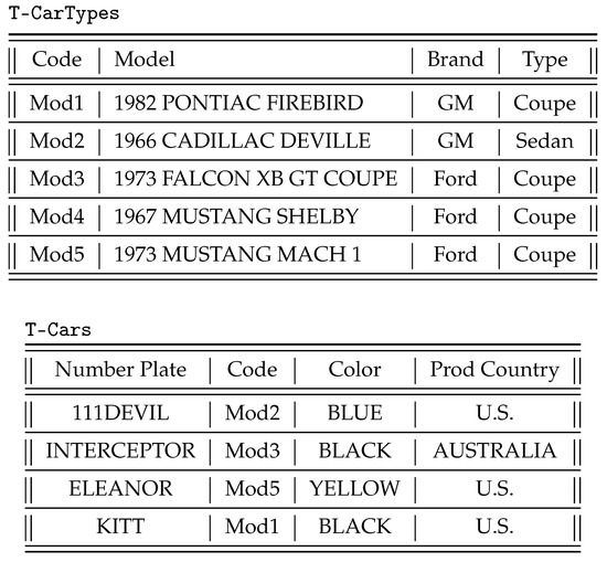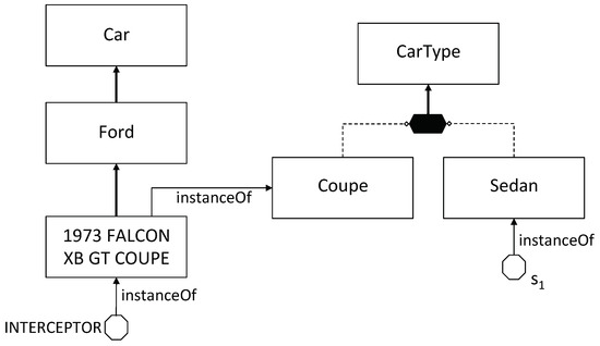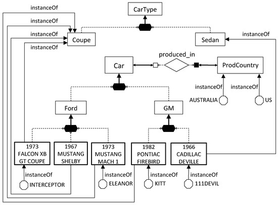 In Figure 4 we provide a graphical representation of aKB modeling (a portion of) the domain of cars that we use throughout the paper in our examples. The ontology is drawn in Graphol, a diagrammatic language that allows OWL ontologies to be graphically specified [25,26]. In Graphol, as in ER diagrams, concepts and roles are denoted by rectangles and diamonds, respectively, and solid directed arrows represent inclusions. The full hexagon denotes at the same time the union of the concepts connected to it through a dashed line and the disjunction of such concepts. Finally, each octagon represents an individual, and each arrow labeled instance Of from and element A to an element B specifies that A is an instance of B. In words, the ontology is saying thatandare specific types of Cars (i.e., they are sub-concepts of), and that they are disjoint. In addition,is an instance of Coupe (in this respect it can also be seen as an individual) and at the same time it is a concept that specializes(i.e., it is a subconcept of) and hasas an instance. Finally,is a subconcept of, andis an instance of.