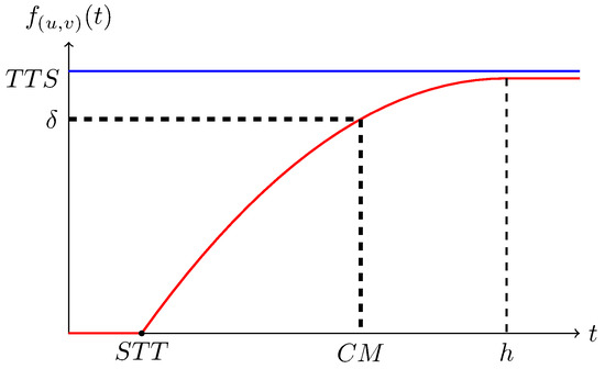 We call the moment that the function value becomes nonzero the shortest transmission time (STT) (theoretically, ). In addition, the speed function is upper bounded as the transmission speed cannot approach infinity in practice. We call the least upper bound theoretically transmission speed (TTS). Remarkably, TTS may never be reached and is thus not very useful. To solve the problem, we can choose some proper threshold , the lowest acceptable speed. We call the time to reach the threshold the critical moment (CM).
