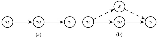 Consider a linear graph (see Figure 2a). The points sent by u and received by v must be retransmitted by w. Thus, the difficulty to transfer points from u to v is not less than the one from u to v through w. Notice that the difficulty for nodes to receive and send points has been included in SRSM and so indicated in the edge’s weights. Hence, the equality should hold. In other words, if w is a cutting node on the path from u to v. To add on, the transmission difficulty does not increase if we add another node s for redirection (see Figure 2b). Thus, in general, we have .