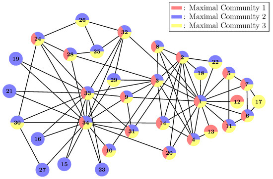 The graph we use for demonstration is Zachary’s karate club (Figure 5) [35], which is a popular test case in the community detection research. At first, we need to choose some proper CP, which is the lower bound of the relation strength within the communities. Here, we let . Then, we use the Klein–Randic method to compute the resistance distance for each pair of nodes in the network and get the corresponding resistance matrix R. After that, we get the corresponding adjoint graph (adj) from R and remove all the edges whose weights are greater than CP. Thus, we get the efficient edges graph (eeg). Then, we apply the Bron–Kerbosch algorithm on eeg and get a list of maximal communities. In Figure 5, we plot those maximal communities in the original graph. Here, we have three maximal communities represented by red, blue and yellow, respectively. Some nodes are multi-colour, which means they belong to various maximal communities simultaneously.