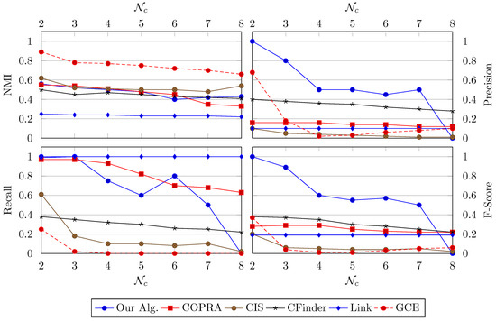 From Figure 6, we can observe that our algorithm has a competitive NMI. The F-score of our algorithm, like others, has a negative relationship with . However, it still has a better performance. Remarkably, when equals two, the average F-score of our algorithm is around , which implies that the algorithm has found almost all local community structures. As increases, compared with other methods, our method maintains a higher score until .