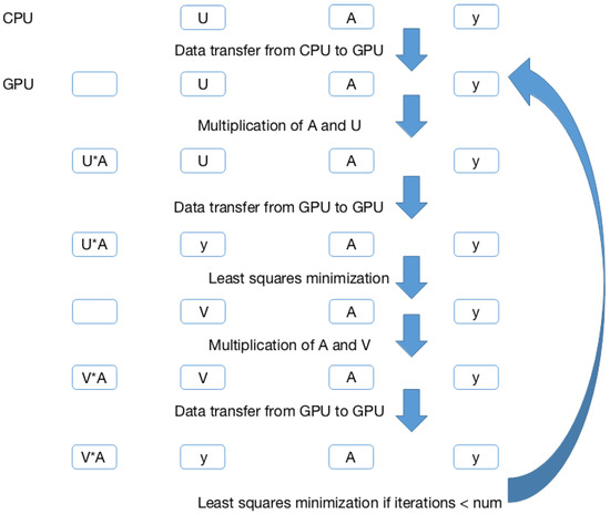The process of estimating is similar to estimating , which is implemented with the corresponding transposed matrix (Algorithm 2 Lines 6–12). Next, the above process is repeated until the number of iterations reaches the set value. Lastly, the two estimated matrices are multiplied to get the final result matrix (Algorithm 2, Line 14).