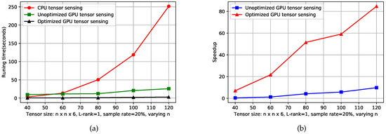 Figure 5a shows that the running time of the CPU tensor sensing and two GPU tensor sensing implementations (unoptimized and optimized ones) for of size of rank one, where n varies from 40–120 at a step of 20. The sampling rate was set to 20%, and both CPU and GPU tensor sensing performed five iterations for completion. The detailed time value is listed in Table 2. While sampling rate and , the scale of the main operation matrix increased at a rate of four times as the increase rate of n.