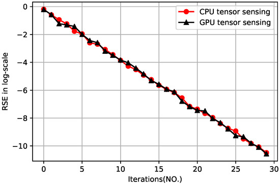 This experiment evaluated the error rate of the CPU and GPU tensor sensing under different iterations for of size with rank six. The sampling rate was set to 50%. Figure 6b shows the recovery results with 10 iterations. The running time of the CPU tensor sensing at five iterations was 14.91 s on average, while the running time of the GPU tensor sensing was 0.97 s on average; thus, the speedup is . As shown in Figure 7, under increased iterations from 1–30, the RSEs dropped significantly. More importantly, the CPU tensor sensing and GPU implementation achieved almost the same RSEs at all iterations (the two curves in Figure 7 overlap with each other), which means that they achieved similar error rate performance in tensor sensing.