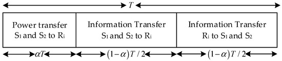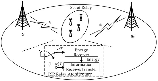 Although cooperative communication has many advantages, the node power constraint is still a tricky problem. Since relay nodes are always placed in harsh or dangerous places, recharging or replacing batteries of relay nodes may be inconvenient and can incur a high cost [4]. Energy harvesting technology has recently emerged as a promising approach to prolong the lifetime of energy-constrained wireless network from ambient energy, such as wind, solar, etc. However, the received energy at nodes is random and intermittent, which motivates an upsurge of research interest on radio frequency (RF)-based simultaneously wireless information and power transfer [5,6,7]. For RF energy harvesting relay nodes, there are two major energy harvesting relay protocols, which are named as “time switching relay (TSR) protocol” and “power splitting relay (PSR) protocol”. For the TSR protocol, the receiver switches two statuses between information decoding and energy harvesting. For the PSR protocol, the receiver splits the signal into two streams of a different power for providing the transmission power and decoding information separately to complete the whole transmission. In one study [8], a dynamic PS scheme was proposed to split the received signal with adjustable power levels based on the instantaneous channel condition, which could obtain the optimal PS rule at the receiver to achieve various trade-offs between the maximum ergodic capacity and the maximum average harvested energy. For another performance standard, outage probability was investigated in PSR asymmetric two-way relay system [9]. In addition, the system outage performance was studied when the channel state information was imperfect [10]. Additionally, a multi-relay cooperation system could be used to improve the sum rate with PSR protocol [11]. Thus, some paper propose that PSR theoretically achieves better performance [12]. However, PS requires appropriate power split circuits to decide how much of the signal is harvested as energy and how much of it is used for extracting information. This in turn, increases the complexity/cost of the hardware. On the other hand, hardware non-idealities can significantly reduce the efficiency of PS technology [13]. Therefore, TS can be widely investigated due to its low implementation complexity [14,15]. In another study [16], the throughput of the TSR one-way relay system was investigated. In this paper, we employ the TS protocol in TWRN.