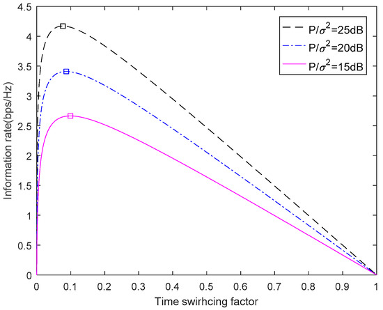 Figure 3 depicts the information rate curves of using different SNRs under various TS factor . It can be observed that these curves have the same tendency under the different total transmit power constraints. From the trend, the three curves are concave, which demonstrate the accuracy of the analysis in Section 3. As can be seen from Figure 3, the system information rate can achieve 2.67 bps/HZ when the total transmitted power is 15 dB. When the total transmitted power is 20 dB, the system information rate can achieve 3.387 bps/HZ. When the total transmitted power is 25 dB, the system information rate can achieve 4.2 bps/HZ. We note that the optimal TS factor can be found in the range (0, 1).