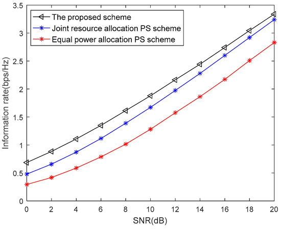Then, we select the cooperative relay node from the relay set, which can maximize the information rate. For the equal power allocation scheme, two source nodes have equal transmission power and the relay selection is random. As shown in Figure 4, the performance of the proposed scheme is better than the other two PS schemes where the SNR ranges from 0 dB to 20 dB. That is because the PS factor is fixed and the cooperative relay is chosen randomly while the proposed scheme has the optimal TS factor, the optimal cooperative relay and the optimal power allocation.