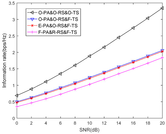 Figure 5 shows the information rate of our proposed scheme under four different cases. The fix TS factor is set as . Case 1 is the proposed algorithm that has the optimal relay, the optimal power allocation and the optimal TS factor, which is called O-PA&O-RS&O-TS. The optimal relay, the optimal power allocation and the fixed TS factor is called O-PA&O-RS&F-TS as case 2. Case 3 is the optimal relay, the equal power allocation and the fixed TS factor, which is called E-PA&O-RS&F-TS. Case 4 is the random relay, the equal power allocation and the fixed TS factor, which is called E-PA&R-RS&F-TS. From Figure 5, we note that the optimal relay selection has a great impact on the information rate by comparing case 3 and case 4. However, the information rate of case 2 and case 3 are very similar, for the system only allocates power to two source nodes, and the channels are distributed and independent. As shown in Figure 5, case 4 has the worst performance in four algorithms. The performance of case 2 and case 3 are improved compared with case 4, while the proposed algorithm has the best performance. The information rate of the proposed scheme is about 1.4 bps/HZ higher than case 2 and case 3 when SNR = 20 dB.