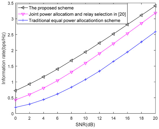 Figure 6 displays the information rate versus SNR by comparing the proposed scheme, joint power allocation and relay selection in [20] and the traditional equal power allocation (EPA) scheme. From reference [20], the optimal values of , and can be obtained as