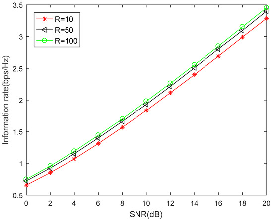 As shown in Figure 7, the number of relay nodes in the relay set has an impact on the information rate. The proposed algorithm has the lowest information rate when . As the number of relays increases, the information rate increases. When the number of relays reaches 100, the information rate can reach 3.49 bps/HZ. The improvement of the information rate can reach 0.1 bps/HZ when the relay numbers from 10 to 50. However, the improvement of the information rate is only about 0.02 bps/HZ when the relay numbers from 50 to 100, which indicates that excessive candidate relays do not significantly improve the information rate. In future research, we can expand the optimal number of candidate relays in this study.