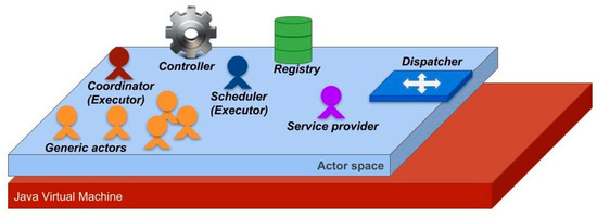 In particular, an actor space performs its tasks through three main runtime components (i.e., controller, dispatcher and registry) and through two runtime actors (i.e., the executor and the service provider).