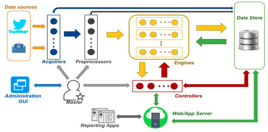 - Fornacciari, P.; Mordonini, M.; Poggi, A.; Tomaiuolo, M. Software Actors for Continuous Social Media Analysis. In Proceedings of the 19th Workshop “From Objects to Agents”, WOA 2017, Scilla, Italy, 15–16 June 2017; Volume 1867, pp. 84–89. [Google Scholar]
