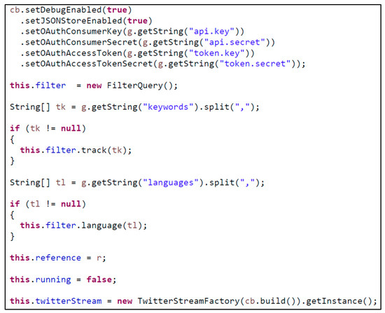 As introduced above, for each type of agent there are different implementations. For this type of agent there are two implementations. The first supports the filtering of Twitter messages (in this case, filtering is based on the Twitter API and text pattern matching) and the second supports the filtering of email messages (in this case, filtering is based on the JavaMail API and text pattern matching). Figure 3 shows the code of a filter selecting Twitter messages on the basis of their language and the presence of keywords.